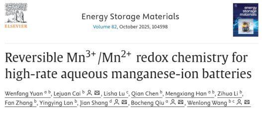 近日,理学院邱博诚教授团队在材料领域国际知名期刊《Energy Storage Materials》上发表题为“Reversible Mn3+/Mn2+redox chemistry for high-rate aqueous manganese-ion batteries”的研究论文。该研究基于可逆Mn³⁺/Mn²⁺氧化还原化学实现高倍率水系锰离子电池,为锰离子电池在电网级储能领域的应用提供了新思路。