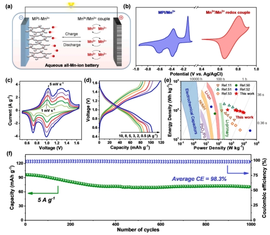 锰元素因其丰富的资源、多变的价态(Mn⁴⁺/Mn³⁺/Mn²⁺/Mn⁰)和良好的配位化学特性,成为构建多电子转移储能体系的重要候选。然而,在水系电解液中,Mn³⁺极易发生歧化反应生成MnO₂和Mn²⁺,导致活性物种流失和容量衰减。此外,Mn³⁺的穿梭效应也会引发自放电、库仑效率降低等问题,严重制约其在静态电池体系中的应用。