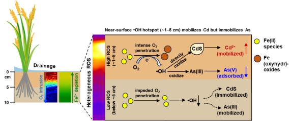 镉和砷是稻田中典型的有毒重金属与类金属,其环境行为强烈依赖于土壤氧化还原状态的动态变化。稻田淹水期镉因生成硫化镉沉淀而被固定,砷则因还原为三价形态而活性增强;排水期则相反—镉活化、砷氧化被吸附固定。然而,已有研究多集中于土壤整体的氧化还原变化,对于土壤垂直剖面中活性氧物种(如•OH)的空间分布及其对镉、砷行为的影响,仍不清楚。