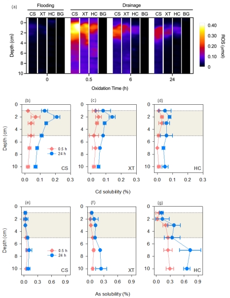 图1.不同稻田土壤垂直空间形成的活性氧(•OH为主导类型)瞬时氧化锋面及其对镉、砷溶解度的影响