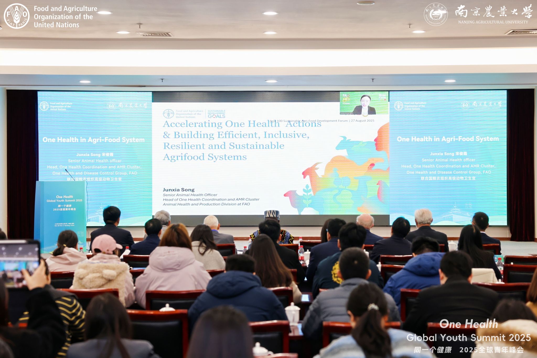 会上,同一个健康青年峰会全球专家组正式成立,标志着国际专家力量与青年创新力量将携手共进,构建更加开放协作的全球健康治理平台。联合国粮农组织高级动物卫生官、One Health协调与AMR集群负责人宋俊霞博士作“One Health in Agri-Food System”主旨报告。