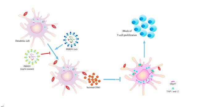 PRRSV is an important pathogen that harms the global pig industry, and the pathogenesis is still not fully understood. Under the support of the National Natural Science Foundation of China and other programs, the research team has found that monocyte-derived dendritic cells (MoDCs) infect by PRRSV significantly inhibiting antigen presentation of MoDCs and T cell proliferation by inducing protein CD83 (sCD83). It is shown for the first time that the zinc finger motif of PRRSV Nsp1α is closely related to the activation of CD83, and is a key functional region for the virus to suppress immunity by sCD83 which is induced by MoDCs. This finding further enriches the theoretical basis of PRRSV immunosuppression and is instructive in the study of PRRSV