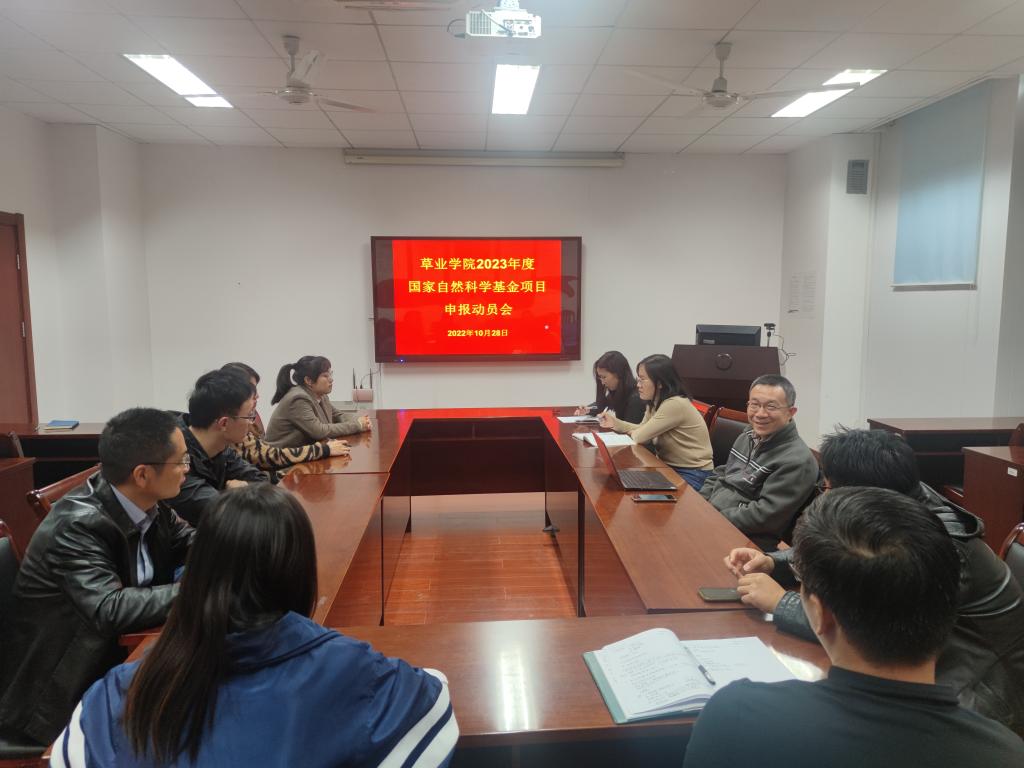 2022年10月28日下午3点,草业学院召开2023年度国家自然科学基金项目申报动员会。因疫情防控需要,会议采用线上、线下相结合的方式,线下主会场在理科南楼F304会议室。院长郭振飞以及草业学院全体符合申报要求的老师均出席了会议。会议由郭振飞院长主持。