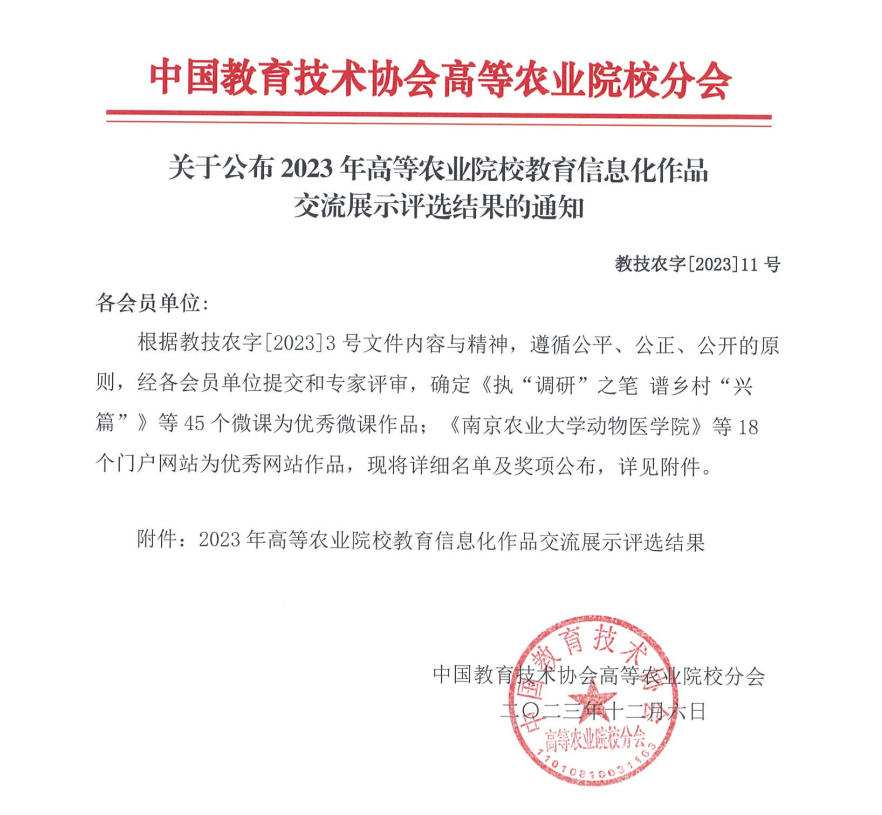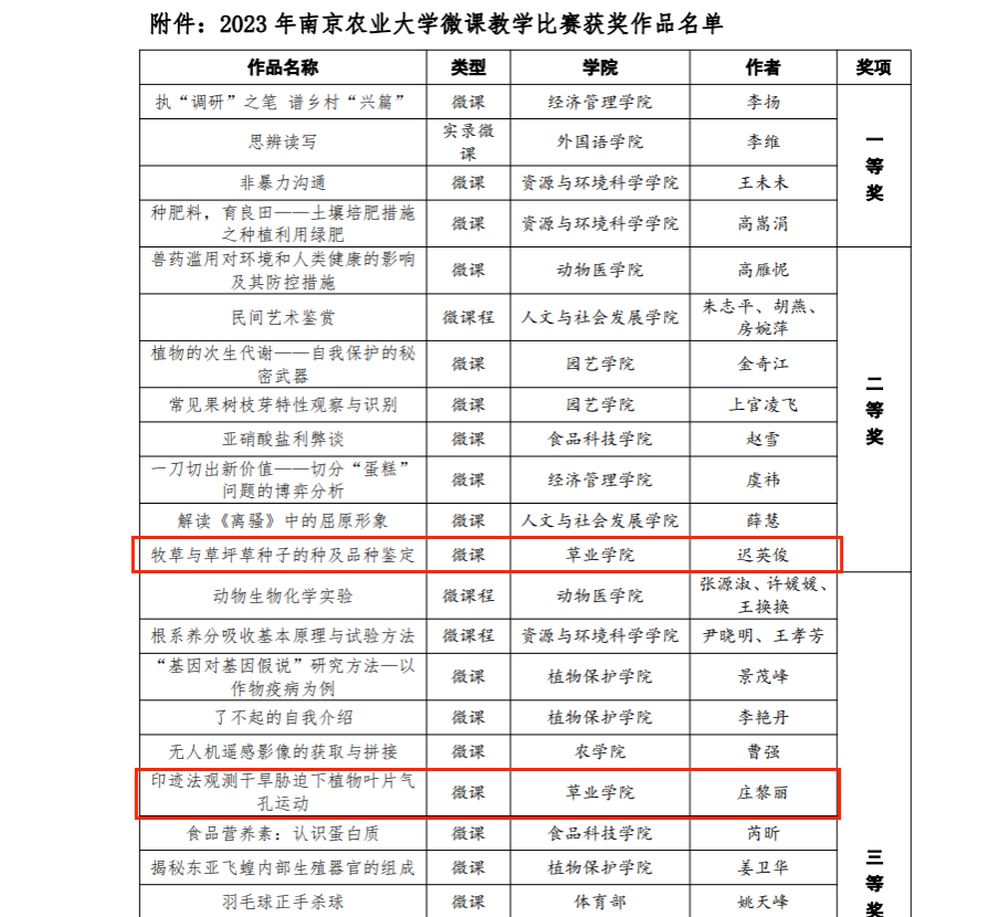 近日,根据校教务处发布的通知,在高等农业院校教育信息化作品交流展示评选中,我院教师庄黎丽的作品《印迹法观测干旱胁迫下植物叶片气孔运动》荣获优秀微课奖,迟英俊、徐彬、张敬的作品《火眼金睛辨真身-牧草与草坪草种子的种及品种鉴定》荣获微课优胜奖。