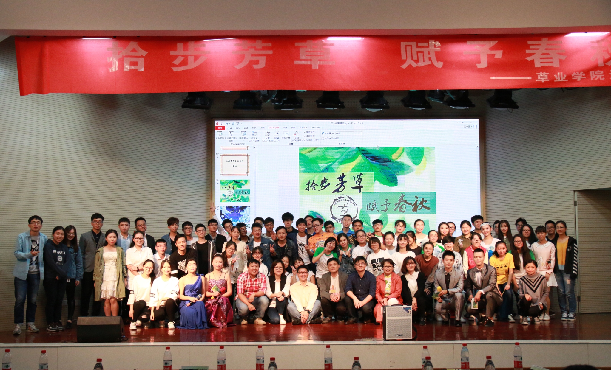 整场晚会在《小幸运》的歌声中进入尾声,全体工作人员上台致谢。我院“拾步芳草,赋予春秋”2016级草业学院迎新晚会圆满举行。活动后,全体演职人员合影留念。
