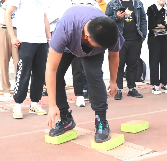 (1)四人一组,每个参赛队员三块“石头”,双脚分别踩在两块“石头”上,用手来移动另一块“石头”,通过“石头”交替前移过河(沿跑道前行20米)。