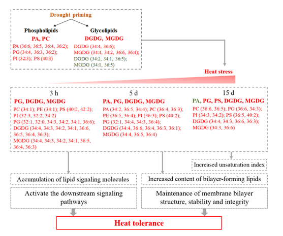 研究人员通过进一步的分析发现,干旱锻炼一方面诱导了信号脂类磷脂酸(PA)及其合成前体磷脂酰胆碱(PC)等的积累,从而激活下游胁迫信号通路,帮助植物应对高温逆境;另一方面通过调节各脂质组分含量,提高了易于维持双分子层稳定性的脂质含量,增加了膜脂不饱和度,维持了高温下膜双分子层的结构稳定性及完整性,进而提高高羊茅植株高温胁迫耐性。该研究结果以“Lipi-domic reprogramming associated with drought stress priming-enhanced heat tolerance in tall fescue (Festuca arundinacea)”为题近日在国际知名学术期刊《Plant, Cell & Environment》(5年影响因子6.151)发表。