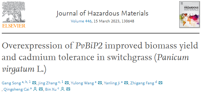 近期,草业学院徐彬研究组和生科院蔡庆生教授合作在Journal of Hazardous Materials在线发表了题为“Overexpression of PvBiP2 improved biomass yield and cadmium tolerance in switchgrass (Panicum virgatum L.)”的研究性论文。