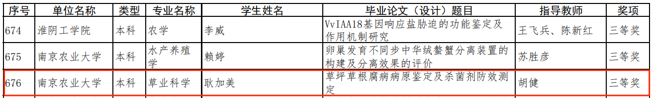 近日,江苏省教育厅公布了2021年度江苏省普通高校本专科优秀毕业论文(设计)评选结果,我院胡健老师指导本科生耿加美完成的本科毕业论文(设计)《草坪草根腐病病原鉴定杀菌剂防效测定》获得江苏省优秀本科毕业论文(设计)三等奖。毕业论文(设计)工作是人才培养的重要环节,是检验学生综合运用专业知识、考察学院教学和人才培养质量的主要依据之一。今后,我院将继续高度重视毕业论文(设计)质量的提升,不断加强质量管理与监控,不断创新管理模式,保障毕业论文(设计)的整体质量不断提升。