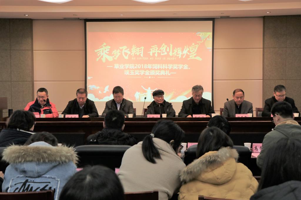 2019年1月11日,草业学院在行政北楼会议室举行了“2018年饲料科学奖学金、璞玉草业科学奖学金颁奖典礼”。86岁高龄的王槐三教授、校发展委员会张红生主任、江苏波杜农牧股份有限公司尤佩华总经理等嘉宾应邀出席,学院党总支书记李俊龙 、副书记高务龙以及全体教师、研究生和部分本科生参加了会议。典礼由草业学院院长郭振飞主持。