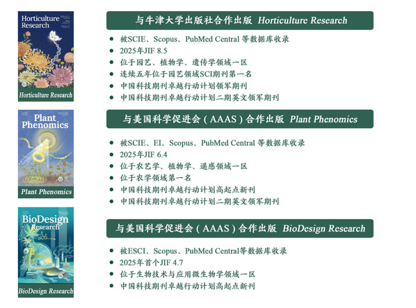 打造世界一流科技期刊,提升国际学术话语权。集中优势资源打造国际旗舰期刊,形成以农业与生命科学为特色的世界一流科技期刊集群。学校主办三本英文科技期刊,均已被SCIE或ESCI、Scopus、PubMed等国际重要数据库收录,且均入选中国科技期刊卓越行动计划,获批期刊建设经费2710万元。《园艺研究》最新影响因子8.5,连续两期入选卓越计划领军期刊,位于JCR园艺领域第一;《植物表型组学》最新影响因子6.4,先后入选卓越计划高起点新刊、二期英文梯队期刊。《生物设计研究》首个影响因子4.7,入选卓越计划高起点新刊,位于领域一区。依托期刊建设,围绕园艺学、植物表型、生物设计等主题,先后举办20余场次国际学术大会,吸引了来自全球的顶尖科研人员参与研讨,进一步提升了学校在国际学术舞台上的影响力和话语权。
