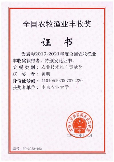 5.新增部省级科技进步一等奖3项:江苏省科学技术进步一等奖、农业农村部神农中华农业科技奖科学研究类成果一等奖、农业农村部2019-2021年度全国农牧渔业丰收奖。