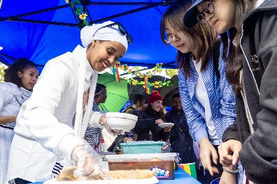 20多个国家的展位各具特色,留学生们身着传统服饰,载歌载舞,邀请师生品尝家乡美食,热情讲解民俗物件。现场欢声笑语,互动热烈,师生们不仅驻足体验,更通过拍照打卡为自己心仪的展位投票,将文化节的交流氛围推向高潮。雨越下,队伍越长。