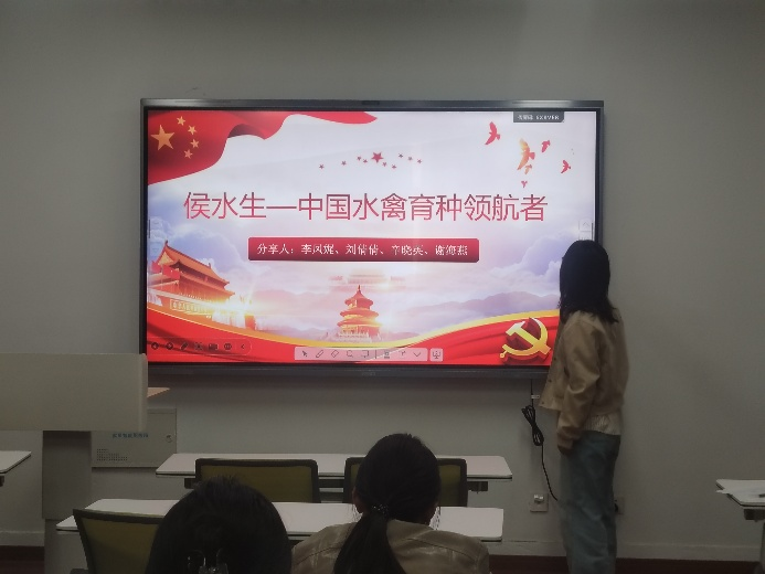 李凤娓代表小组以“侯水生——中国水禽育种的领航者”为题,进行了深入的解读和讨论。她从多维度展现侯水生在水禽育种领域的卓越贡献,并且围绕他的科研历程、关键成果、行业影响及精神品质展开,突出其作为领航者在推动我国水禽产业发展中的重要作用。她通过对侯水生介绍鼓励支部成员要坚守问题导向,秉持工匠精神,把论文写在大地上,把成果用到产业中。