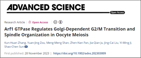 2023年11月28日,ios版雷竞技官网孙少琛教授团队在Advanced Science期刊发表了题为:Arf1 GTPase regulates Golgi-dependent G2/M transition and spindle organization in oocyte meiosis 的研究论文。该研究解析了小GTP酶Arf1在卵母细胞成熟过程对减数分裂恢复(G2/M转换)以及纺锤体组装的重要功能。