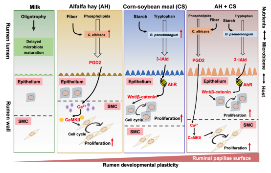 本研究以哺乳羔羊为研究对象,利用极端化早期营养干预策略构建了瘤胃上皮/肌层的差异化发育表型;基于天然植物成分的微生物产物标准物质质谱库、极性/非极性物质的色谱选择策略和高分辨率质谱技术,首次鉴定出与瘤胃上皮和肌层发育密切相关的代谢物吲哚三甲醛(IAld)和前列腺素D2(PGD2);利用宏基因组技术厘清了IAld和PGD2在瘤胃内的微生物合成路径并筛选出候选代谢微生物菌株,进一步通过单菌体外纯培养试验,首次发现假长双歧杆菌可代谢色氨酸生成IAld,白色念珠球菌具有生成PGD2的能力;利用转录组技术锚定瘤胃差异化发育的信号调控通路,体内外试验揭示了IAld通过激活Wnt/β-catenin信号通路促进瘤胃上皮发育,PGD2依赖Ca2+信号通路调控瘤胃肌层发育。研究结果加深了对生命早期日粮-微生物-宿主互作的理解,首次明确了瘤胃特定菌株及其下游代谢物与瘤胃生理的直接联系,为幼龄反刍动物开食料添加剂的开发应用提供新思路。