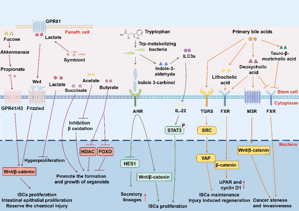 图3:肠道微生物关键代谢产物对ISC的影响以及其调控肠道稳态的途径