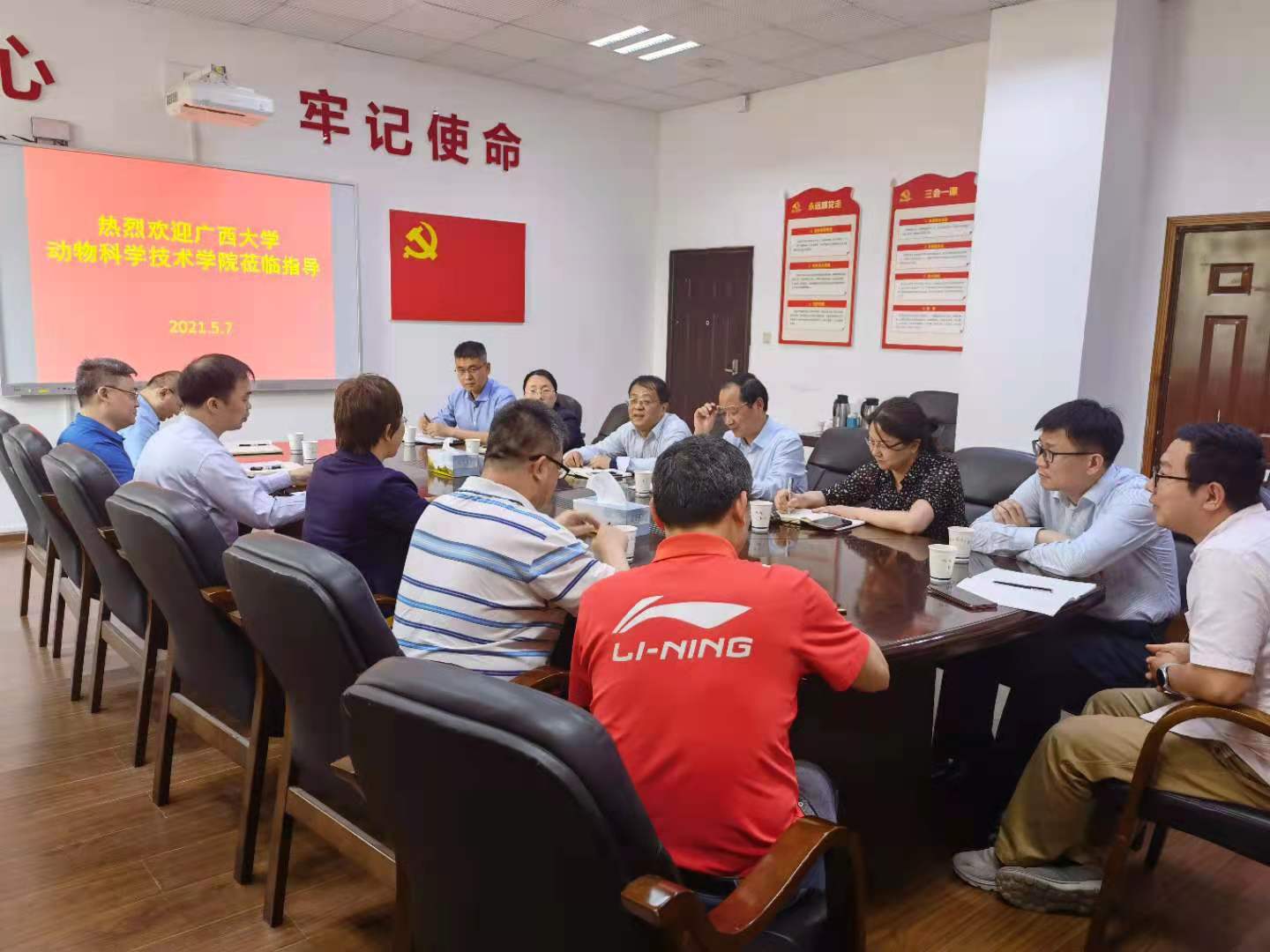 2021年5月7日,广西大学动物科学技术学院党委书记顾慕娴、副院长陆阳清、周磊、司红彬、黄伟坚教授、院办公室主任李爱友一行来学院考察。学院党委书记高峰、副院长孙少琛等领导班子、动物医学院党委书记姜岩、党委副书记、院长姜平共同进行了对口合作座谈会,会上就两校进一步在学术研究、人才培养、学科建设等领域加强深层次对口合作进行了深入探讨,并对下一步具体的合作内容达成共识。
