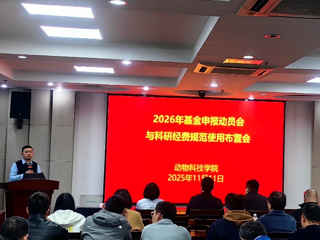 为对接基金申报政策、规范科研经费管理,2025年11月11日下午,动物科技学院在理科楼C303会议室召开2026年基金申报动员会与科研经费规范使用布置会,会议由学院副院长李平华主持,全体专任教师、钟山青年研究员、博士后及四年级博士生参会。
