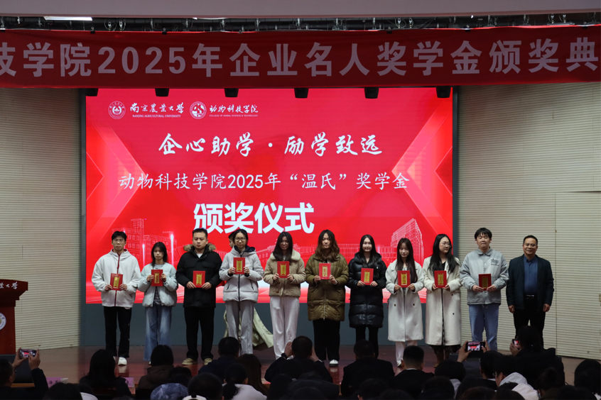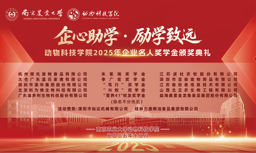 2025年,动物科技学院共有17家企业和单位设立院级企业奖学金,获奖学生达140人。设奖企业及奖学金名单如下: