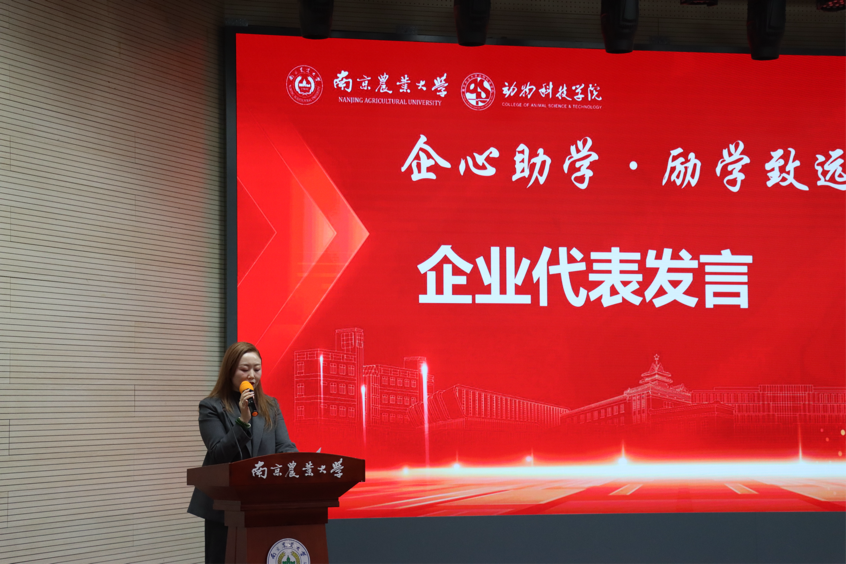 典礼在庄重热烈的氛围中拉开帷幕。设奖企业代表益海(泰州)粮油工业有限公司夏晨女士、杭州领先宠物食品有限公司刘泽慧女士先后致辞,表达了对学子们的诚挚祝贺与未来发展的殷切期望。