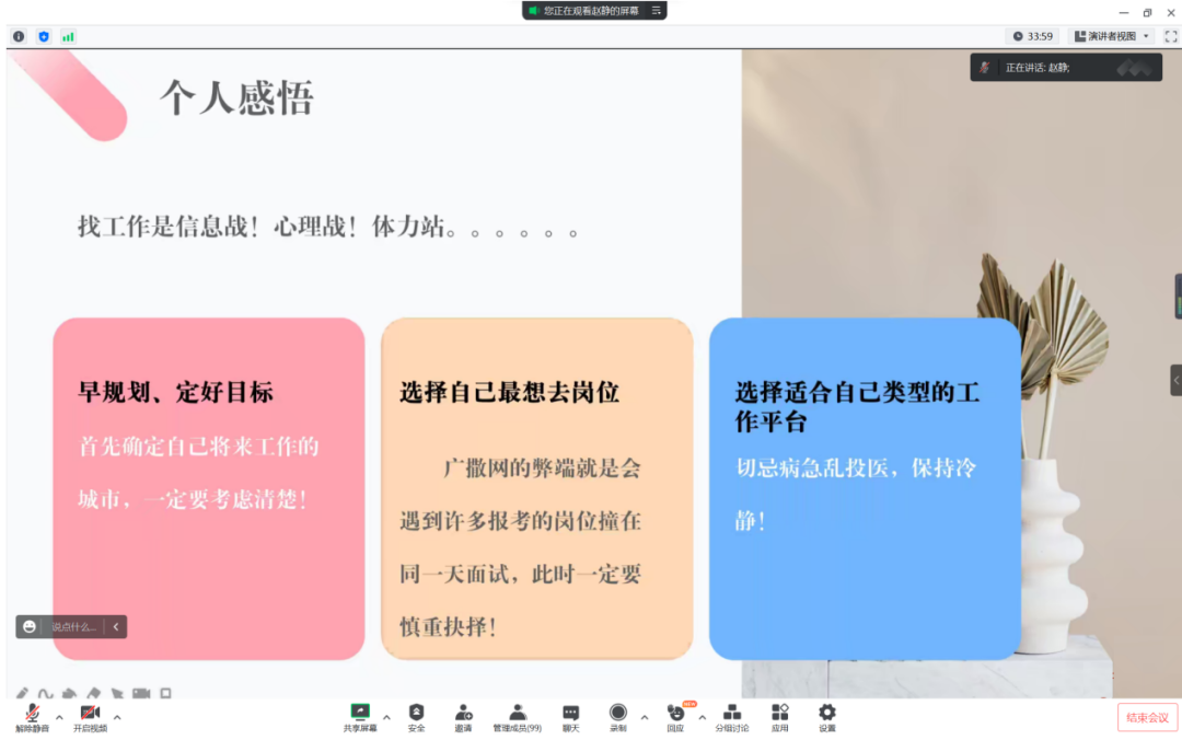分享结束后,汪薇老师表示,同学们要提前做好职业规划,了解行业就业情况,希望通过赵静的经验分享,能拓宽同学们的就业思路,确定自己的就业方向,并做好就业准备。
