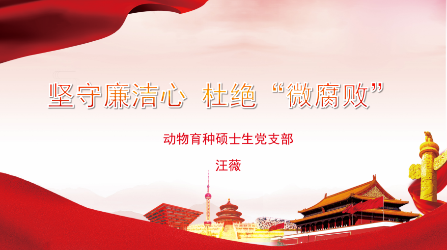 会议开始,支部书记汪薇做题为《坚守廉洁心 杜绝“微腐败”》的党课,号召全体党员要深刻认识“微腐败”的危害性,作为学生党员要不忘初心、廉洁从业、砥砺前行,在大是大非面前把握住自己,在日常小事上坚守心灵的“防护堤”,严于律己,防微杜渐。