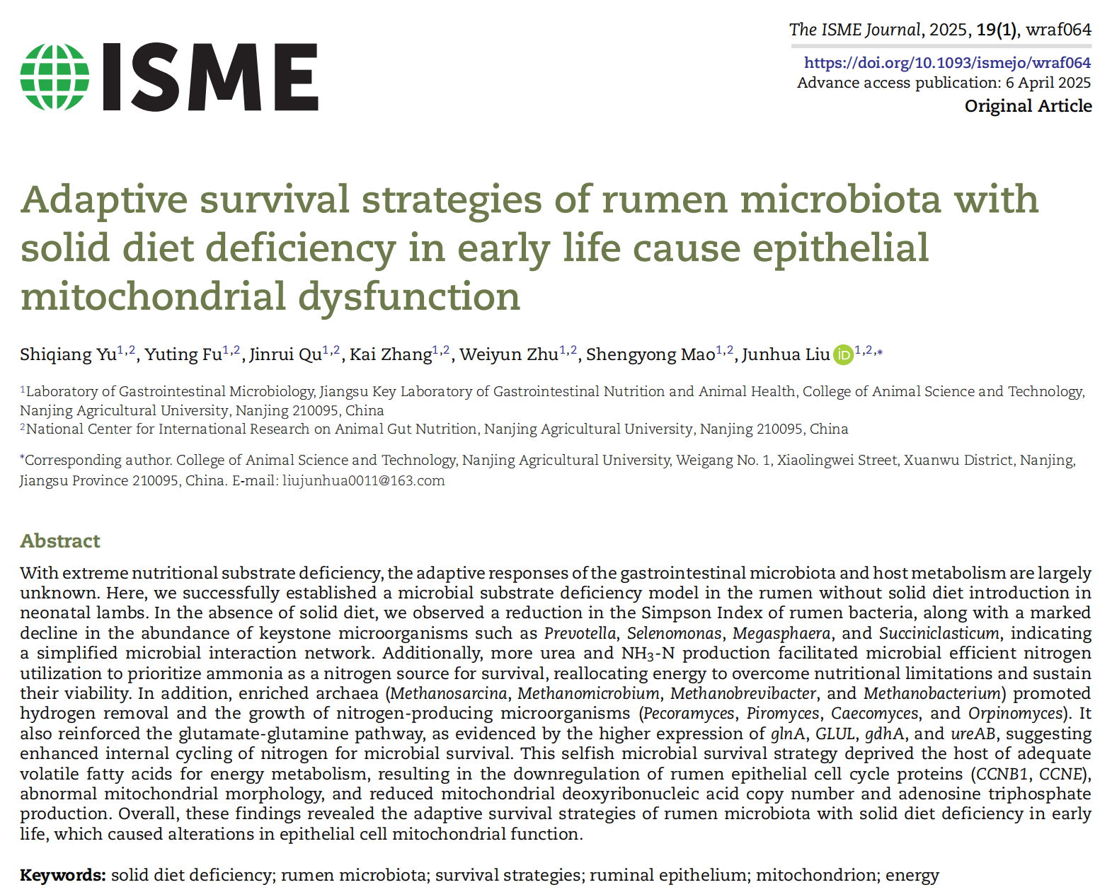 近日,我院反刍动物营养团队在国际著名微生态专业期刊《TheISME Journal》(中科院1区Top, IF:11.8)发表了题为“Adaptive survival strategies of rumen microbiota with solid diet deficiency in early life cause epithelial mitochondrial dysfunction”的研究性论文。