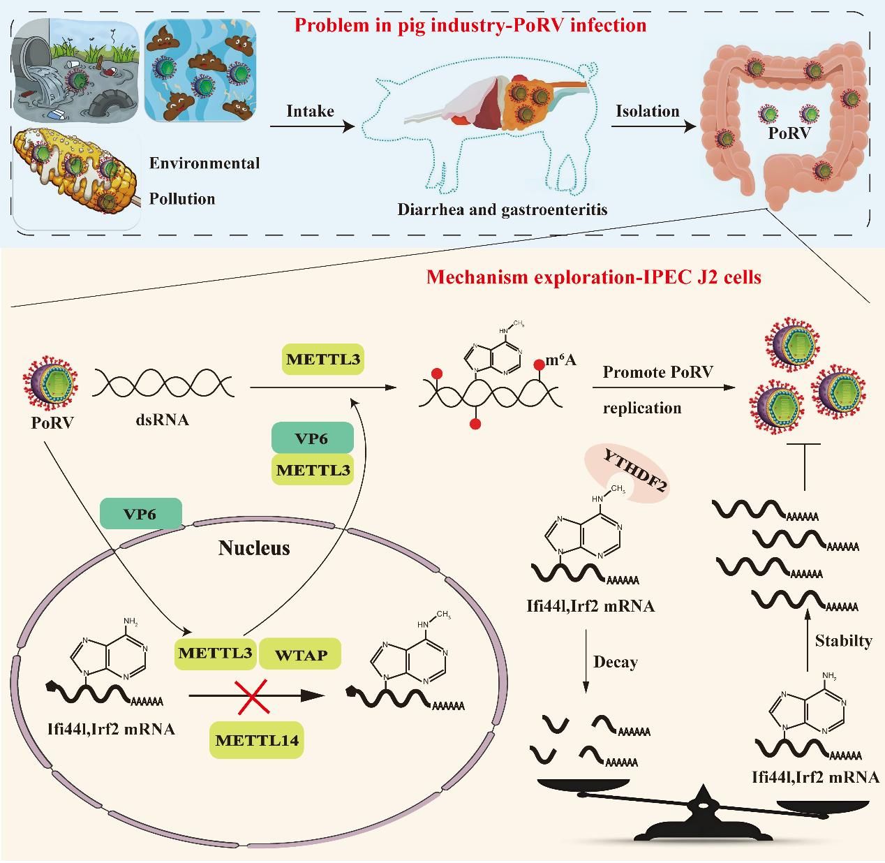 仔猪腹泻是困扰养猪业常见的难题,而猪轮状病毒(PoRV)正是导致这一产业问题的主要元凶之一,给养猪业带来了巨大的经济损失。近日,ios版雷竞技官网钟翔教授与江苏省农业科学院李彬研究员团队在《Cell & Bioscience》发表关于PoRV的最新研究,揭示了其通过劫持宿主细胞的RNA表观遗传修饰系统(m6A甲基化)实现自我复制,而宿主则通过主动降低m6A水平激活抗病毒防御的“攻防战”。这一发现为开发新型抗猪腹泻病药物提供了新的靶点。