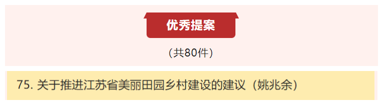 该提案在实地调研的基础上,指出江苏省美丽乡村建设受到土地因素、资金因素、干部队伍因素、农业产业因素、农村居民自身因素的制约,进而从五个方面提出发展建议,指出要加强农村土地使用规划,挖掘农村建设用地空间潜力;加大财政资金投入,创新财政资金投入模式;加强干部队伍建设,提高农村干部待遇;深化农村产业融合,促进农村产业发展;加强宣传和引导,提高农村居民参与意识和责任担当等推进江苏美丽乡村建设的政策建议。