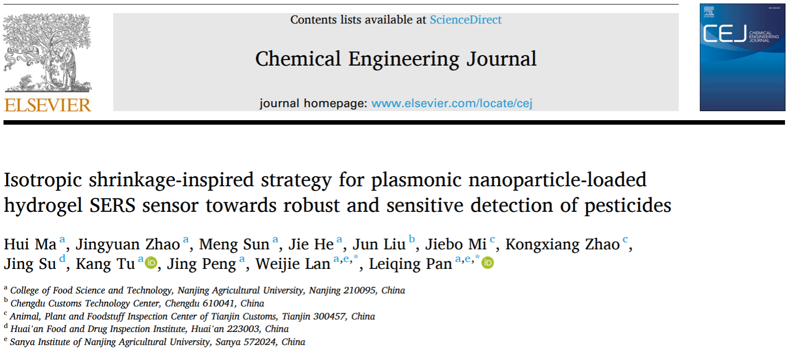 近日,我校食品科技学院屠康教授和潘磊庆教授团队,利用水凝胶体系中“乙醇-水”快速置换促使柔性表面增强拉曼光谱(SERS)基底“热点”致密化,实现了快速、灵敏、多场景的农药残留分析。相关研究成果以“Isotropic shrinkage-inspired strategy for plasmonic nanoparticle-loaded hydrogel SERS sensor towards robust and sensitive detection of pesticides”为题,在国际著名期刊《Chemical Engineering Journal》在线发表。