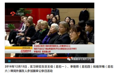 2016年秋季学期,在我院王银泉教授的指导下,2015级翻译专业学位研究生景文佳、李艳茹、杨慧梅、杨苗苗、刘娜娜、郭静等六人前往侵华日军南京大屠杀遇难同胞纪念馆开展实习工作。实习工作分为两个阶段进行,第一阶段为协助纪念馆进行资料整理、讲解接待、史料翻译和公示语纠错等,共整理资料1,183份资料,翻译资料达23000余字。同时,将存在翻译错误的38处公示语标识收集整理并提出改正译文提交至纪念馆有关部门,推动完善纪念馆公共标识语译文整改工作。第二阶段为参与第三个国家公祭日的接待工作。活动期间,他们分头全程陪同各自负责接待陪同的外籍友人家庭,参与了“紫金草国际和平纪念章”颁发仪式和《南京不会忘记》新书发布会,同时协助江苏电视台对外籍人士进行采访。在国家公祭日当天,景文佳、李艳茹、杨慧梅三位同学全程陪同这些外籍友人参加活动,在低温阴雨的天气条件下,坚持同外籍友人一起参加在侵华日军南京大屠杀遇难同胞纪念馆举办的烛光祭活动,为大屠杀遇难同胞亡灵祈福,全程陪同外籍友人参观拉贝故居。