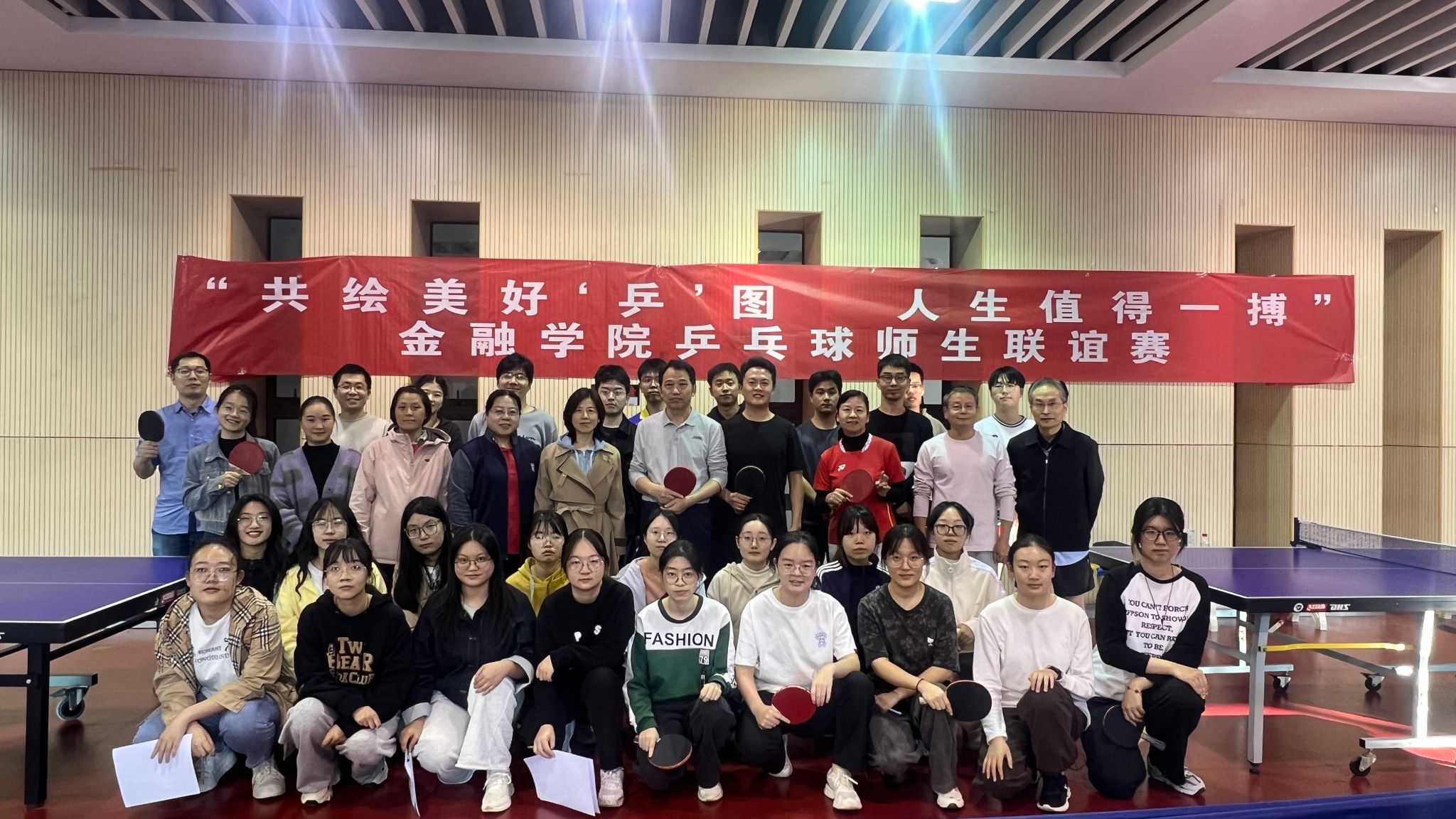 10月23日下午,金融学院在体育馆乒乓球馆举行“共绘美好‘乒’图 人生值得一搏”师生乒乓球联谊赛。30余名师生乒乓球爱好者参与其中。