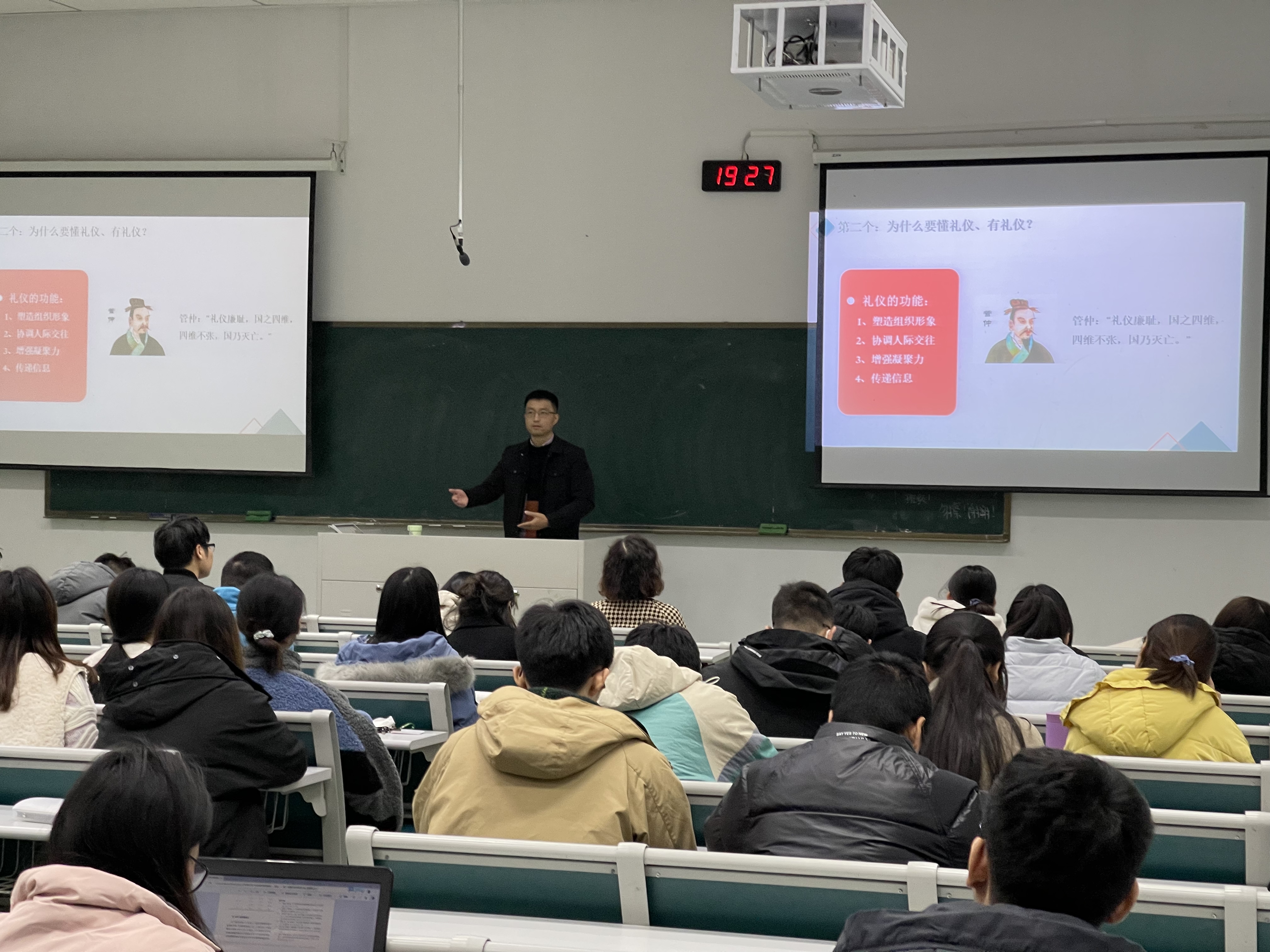 杨海峰指出,研究生无论在什么场合,都要懂礼仪、有礼仪。他分别从形体礼仪、语言礼仪、电话礼仪和接待礼仪等四个方面进行了详细的讲解,并引导在场同学互动操练,加深理解。