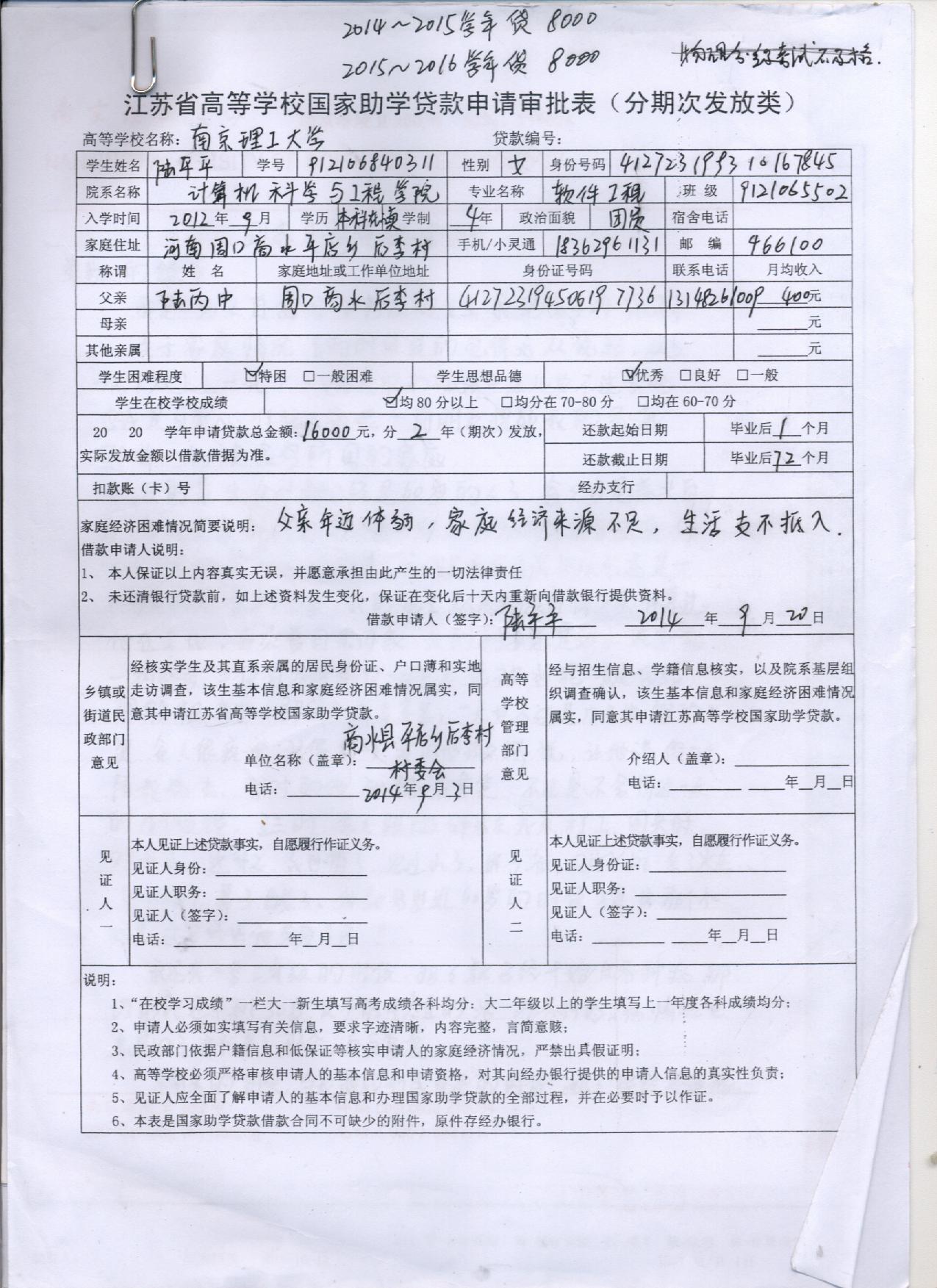 4、下载附件2江苏省高等学校国家助学贷款审批表并打印填写,格式请参照附件3模板,只需填写到学生签字栏即可。