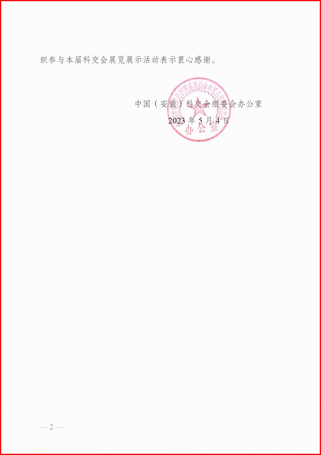 近日,我中心收到中国(安徽)科技创新成果转化交易会组委会办公室的感谢信,对我校积极组织参与第二届中国(安徽)科技创新成果转化交易会表示衷心感谢。