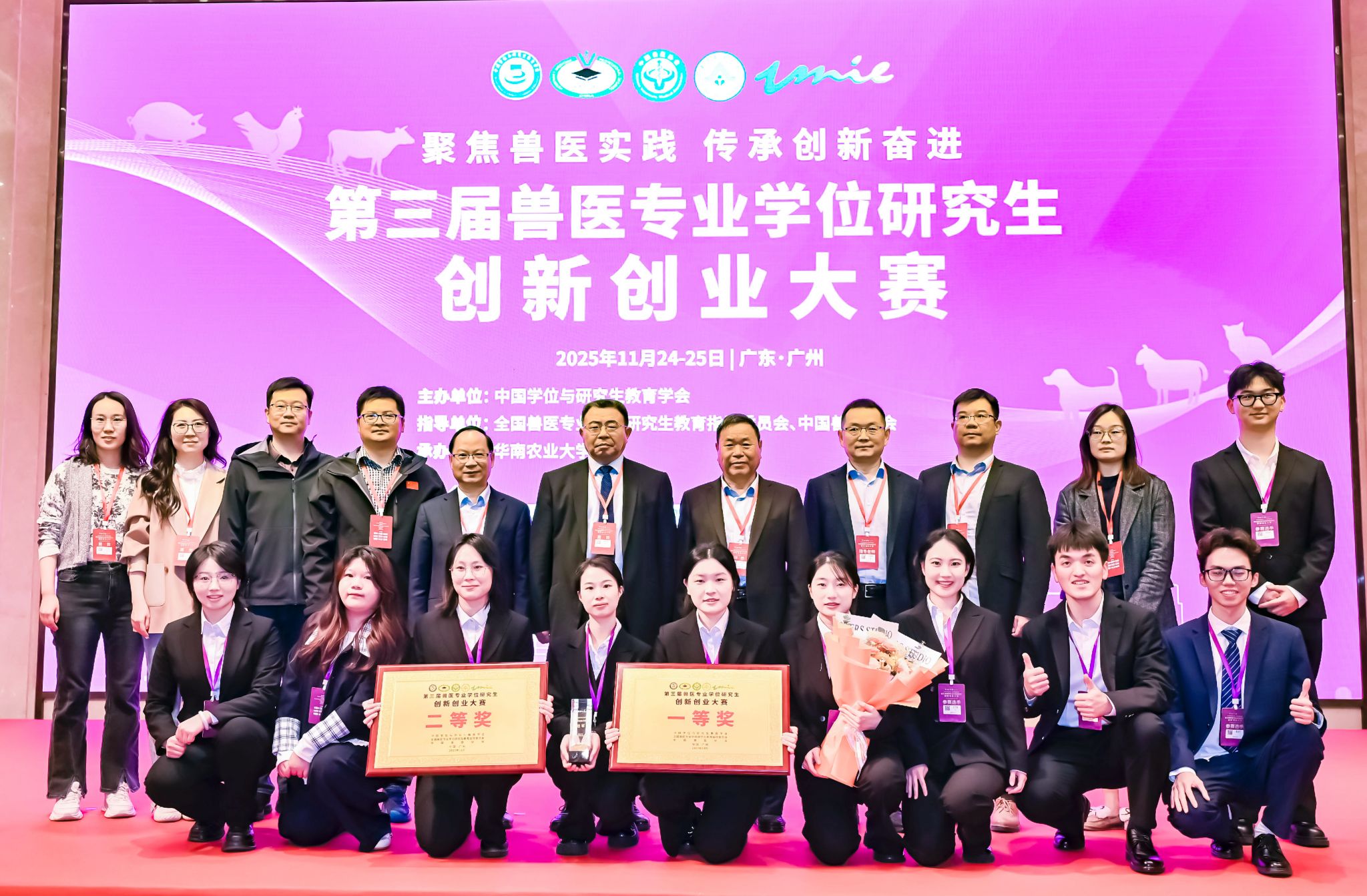 11月24日-25日,由中国学位与研究生教育学会主办,全国兽医专业学位研究生教育指导委员会、中国兽医协会提供学术指导的第三届兽医专业学位研究生创新创业大赛在广州成功举办。由我校动物医学院研究生组建的2支团队在比赛中取得优异成绩,分别获得一等奖和二等奖各一项。