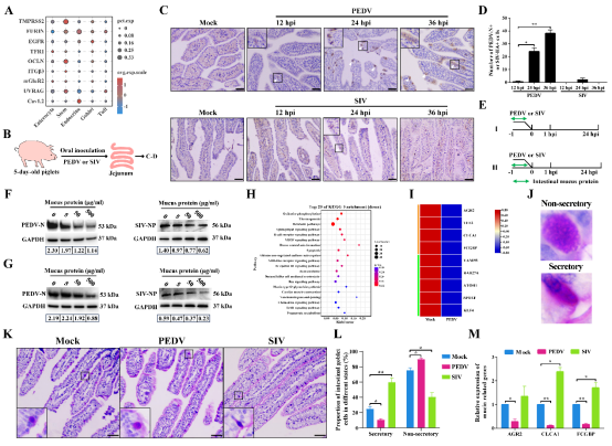 图1. 杯状细胞黏液分泌功能影响PEDV和SIV在肠道黏膜的嗜性