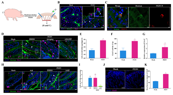 在肠道黏膜中,研究揭示了PEDV更为独特的致病机制。PEDV可通过激活黏膜下神经元的乙酰胆碱-CHRM3信号通路,诱导杯状细胞形成 GAP(Goblet Cell–Associated Antigen Passage)通道。这一本用于递送食物抗原、维持免疫耐受的生理通道在PEDV感染后出现“用途转移”——即便肠道上皮结构仍完整,肠道细菌也可通过GAP进入固有层,引发炎症反应,从而加剧肠道损伤并促进病毒扩增。值得注意的是,阻断CHRM3信号可显著抑制GAP形成,感染仔猪的腹泻、体重下降和组织病变均明显减轻,证明GAP在PEDV高致病性中的关键作用。