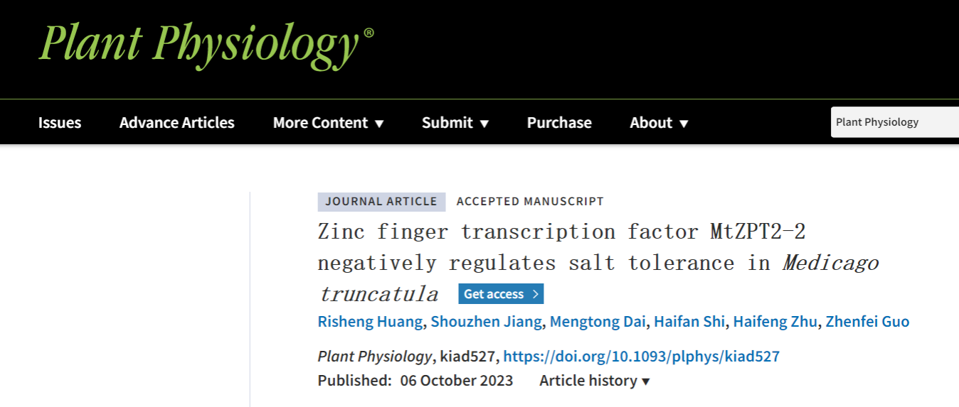 近日,ios版雷竞技官网郭振飞教授团队在Plant Physiology在线发表了题为“Zinc finger transcription factor MtZPT2-2 negatively regulates salt tolerance in Medicago truncatula”的研究论文,揭示了锌指转录因子MtZPT2-2直接抑制高亲合性钾离子转运体MtHKT1;1和MtHKT1;2的表达负调控蒺藜苜蓿耐盐性的分子机制。