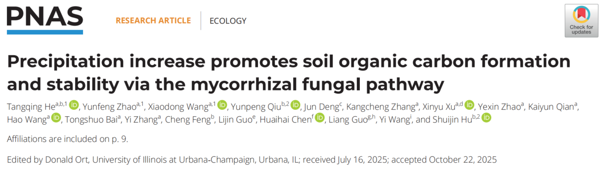 近日,我院胡水金教授团队在《美国科学院院刊》(PNAS)上发表了题为“Precipitation increase promotes soil organic carbon formation and stability via the mycorrhizal fungal pathway”的研究论文。该研究依托黄土高原半干旱草地长期全球变化定位试验站,系统揭示了未来降雨增加情景下土壤有机碳形成与稳定的关键微生物驱动机制,取得重要进展。
