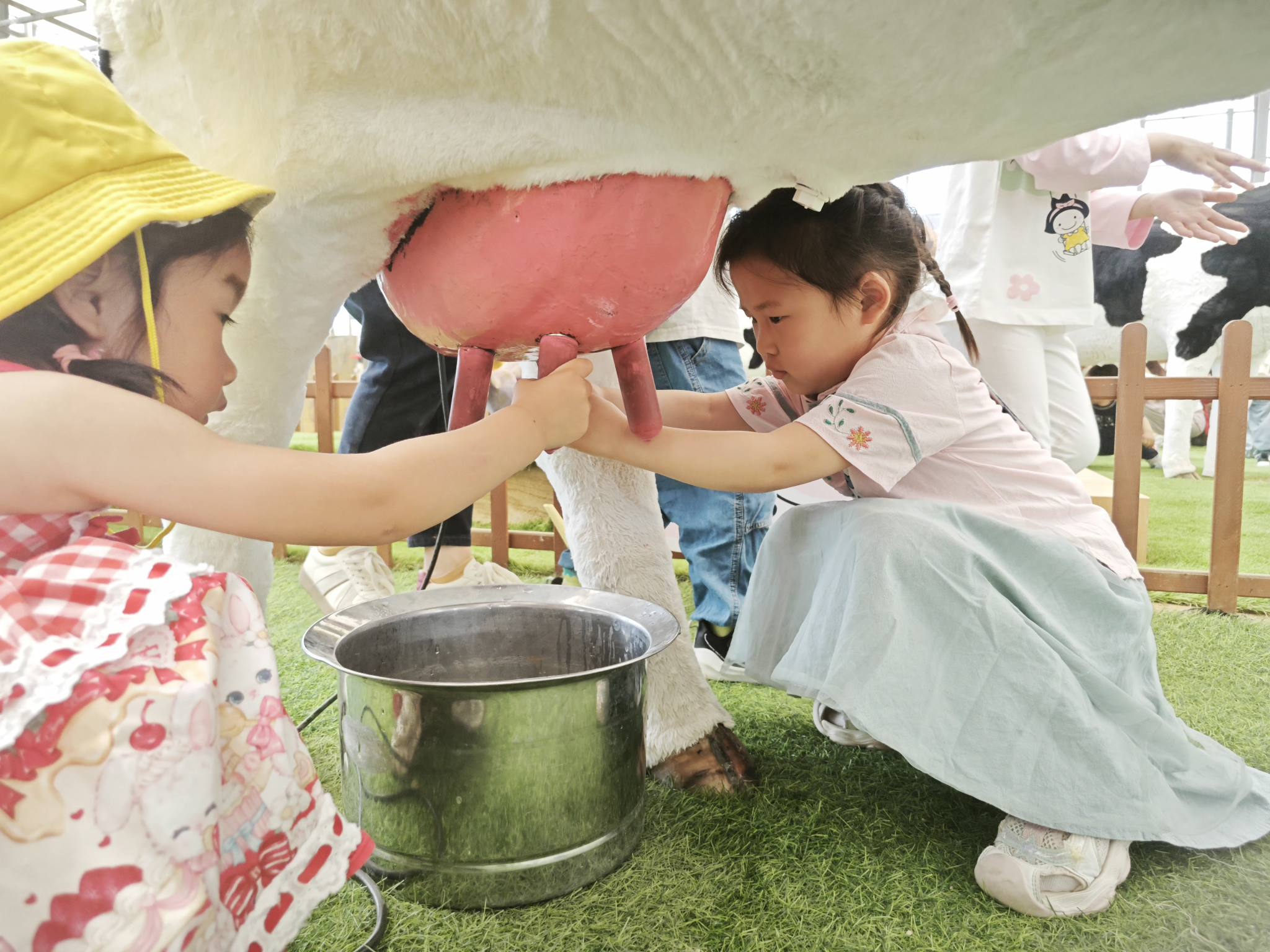 在家长的陪同下,孩子们来到模拟牧场,亲手给软萌的小牛犊喂食,体验挤奶的乐趣。“牛奶原来是这么挤出来的。”“小牛犊吃东西也太好玩了吧。”......孩子们在感叹声中感知生命,在体验中学会关爱。