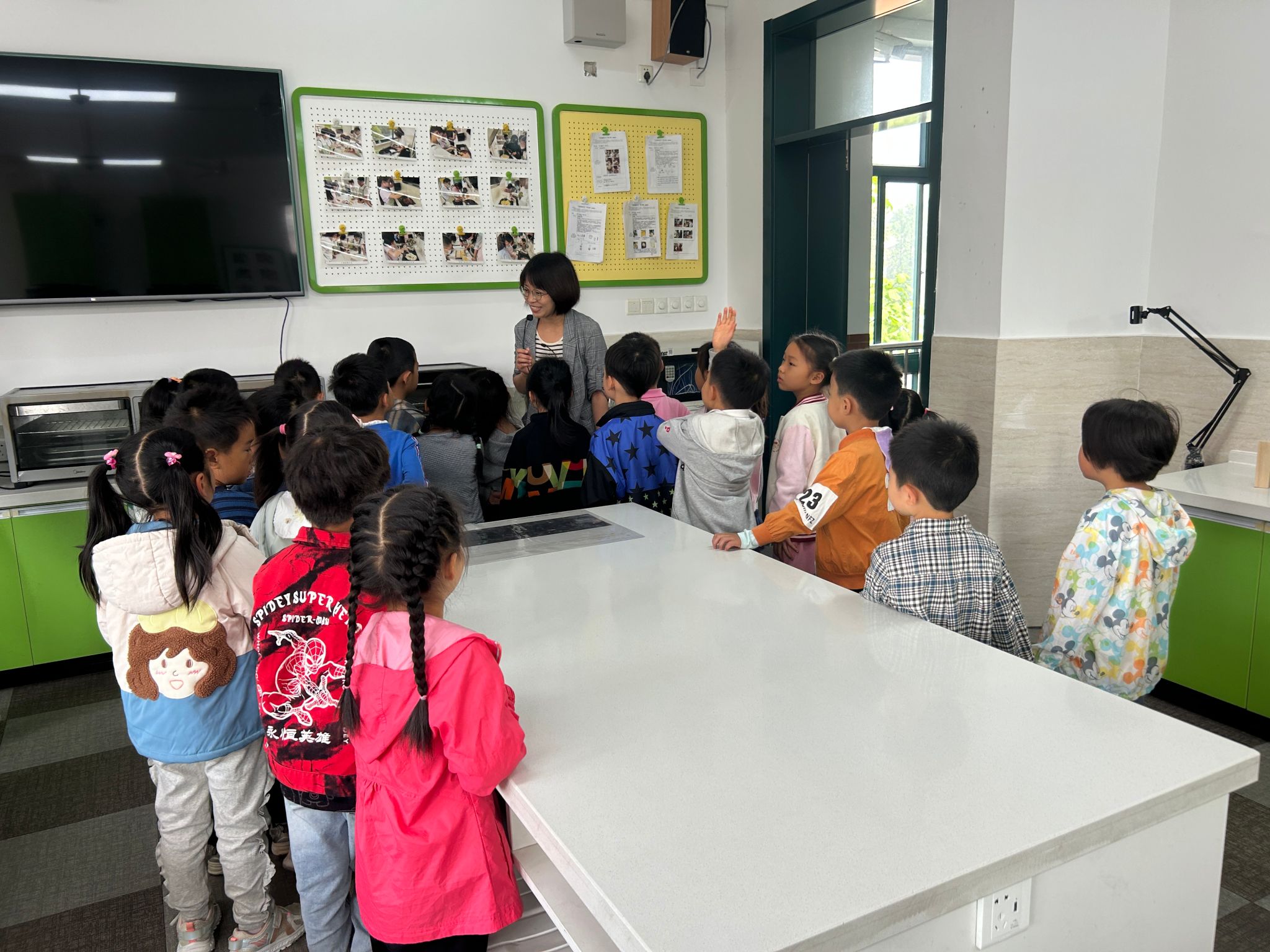 随后,学校精心安排的三位领队老师分别带领三个大班幼儿分组参观校园。小朋友们参观了无土栽培温室,看到了在管道中生长的菜苗;后山种植田里,孩子们看到了整齐的作物和高大的蚕豆植株;在木工坊,孩子们对各种操作材料感到好奇;扎染工坊的艺术作品也吸引了他们。生活体验馆内,孩子们通过实践学习生活技能,体验劳动的快乐。通过参观,孩子们初步感受到小学丰富多样的课程设置和活动内容。