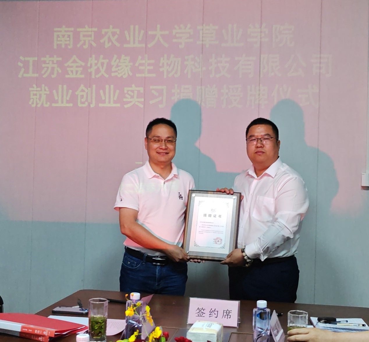 6月20日上午,江苏金牧缘生物科技有限公司总经理、南农校友金志红热情接待了草业学院一行。李俊龙书记介绍了学院的学科建设和学生就业创业等基本情况。金志红总经理介绍了其从南农求学到自主创业的心路历程,表达了对母校的深切感激和关切,同时详细介绍了企业发展历程、业务板块和岗位需求。双方就人才培养、学生就业、产学研合作等进行了深入交流,双方希望以此次访企拓岗为契机,搭建供需对接桥梁,建立稳定的学生实习实训就业、产学研合作关系,实现互利共赢,切实推动高质量就业。双方签订了“就业创业实习基地共建协议”和“捐赠协议”。