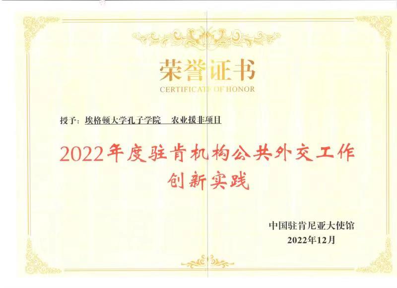 2022年度驻肯机构公共外交工作座谈会在中国驻肯尼亚大使馆举行。驻肯大使周平剑出席会议并致辞。新华社非洲总分社、中央广播电视总台非洲总站、我校孔子学院等单位代表出席会议。会上,埃格顿大学孔子学院农业援非项目获得“2022...