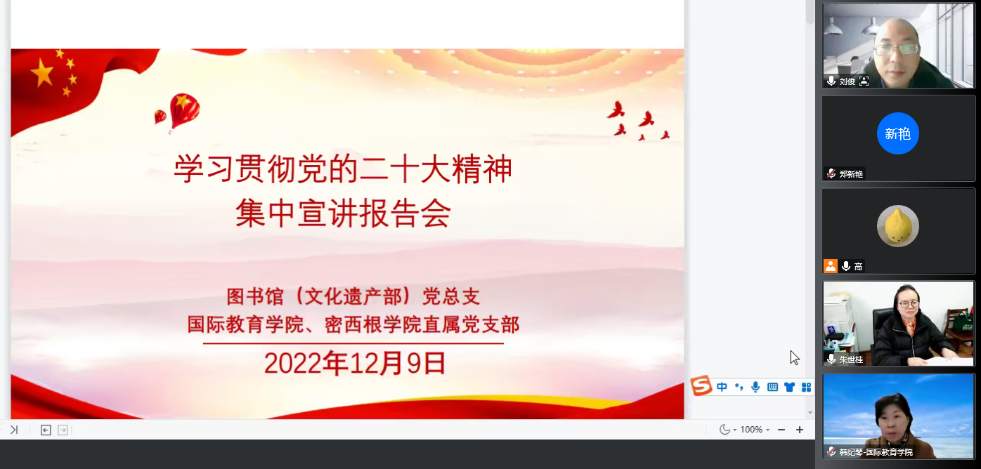12月9日下午,图书馆(文化遗产部)党总支与国际教育学院、密西根学院直属党支部联合召开学习贯彻党的二十大精神集中宣讲报告会。会议邀请了马克思主义学院刘俊副教授作专题报告,全体党员、积极分子以线上的方式参加。本次会议由...