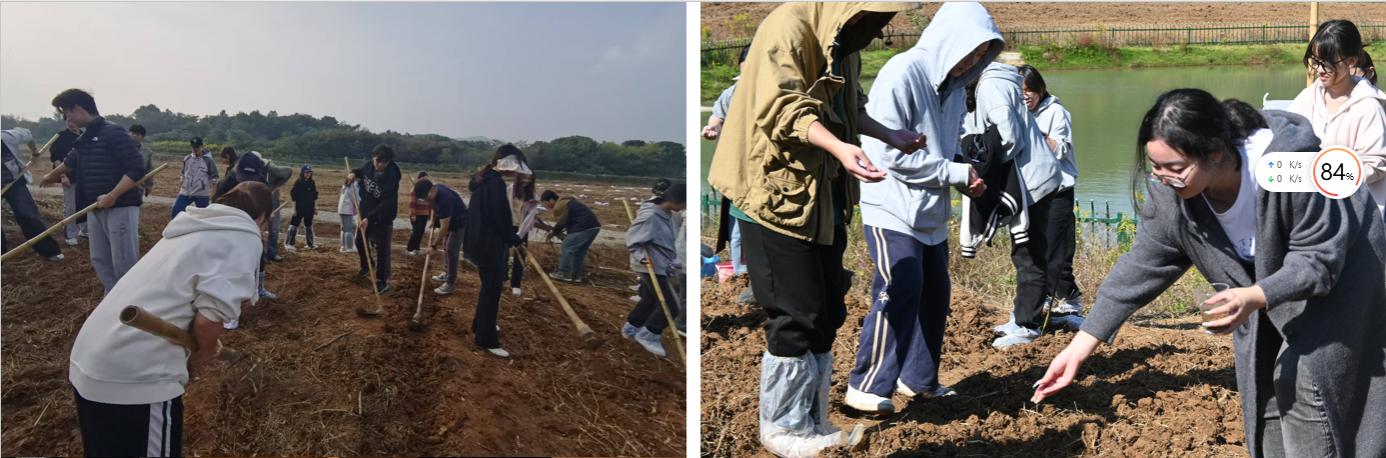 种植牧草时,同学们分成几个小组,用锄头开挖出一道道浅沟,分割出一块块整齐的牧草种植区,并清除其中的杂草,方便进行种植。分区明确后,再使用铁耙分割较大的土块,使得泥土更加细小、平整,以利于牧草生长。最后将牧草的草种均匀地洒向田地里。在温暖的秋日下,脚下的土地是依靠,撒下的草种是希望。
