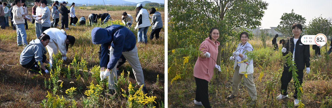 清理一枝黄花时,看着秋阳中摇弋生姿的朵朵黄花,同学们开始还觉得有点可惜。现场指导的老师一下子就看穿了大家的心理,一边指导,一边给大家讲起一枝黄花的前世今生。听完老师对于一枝黄花“表里不一”、肆意疯长、攫取农作物养分等种种恶行的解释,大家便开始齐心协力,毫不留情地把一棵棵一枝黄花连根拔起。在劳作中,同学们也了解了清理外来入侵物种对于守护生物多样性和维护生态安全的重要意义。