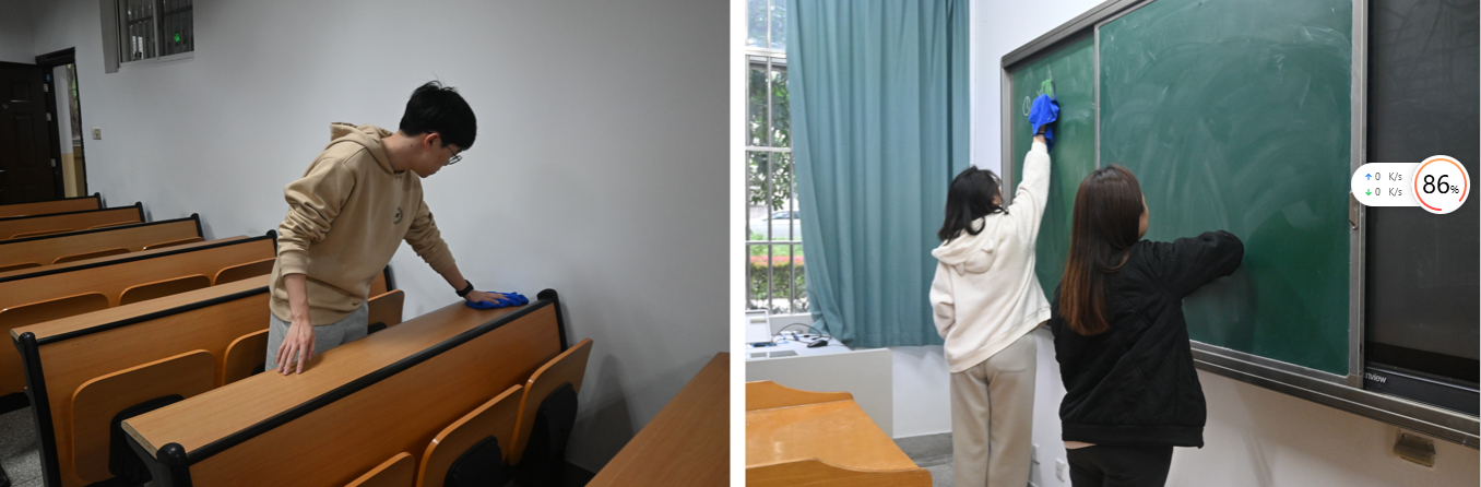 10月26日至27日,全体同学在卫岗校区打扫教学楼教室,并聆听了耕读教育专题讲座。在学校后勤人员的指导与分配下,大家有条不紊地打扫教室地面、清理课桌垃圾、擦拭讲台与黑板,将教室打扫得干干净净。看着打扫出来的各类垃圾与焕然一新的教室,大家都深刻领会到“一屋不扫何以扫天下”的教育意义。