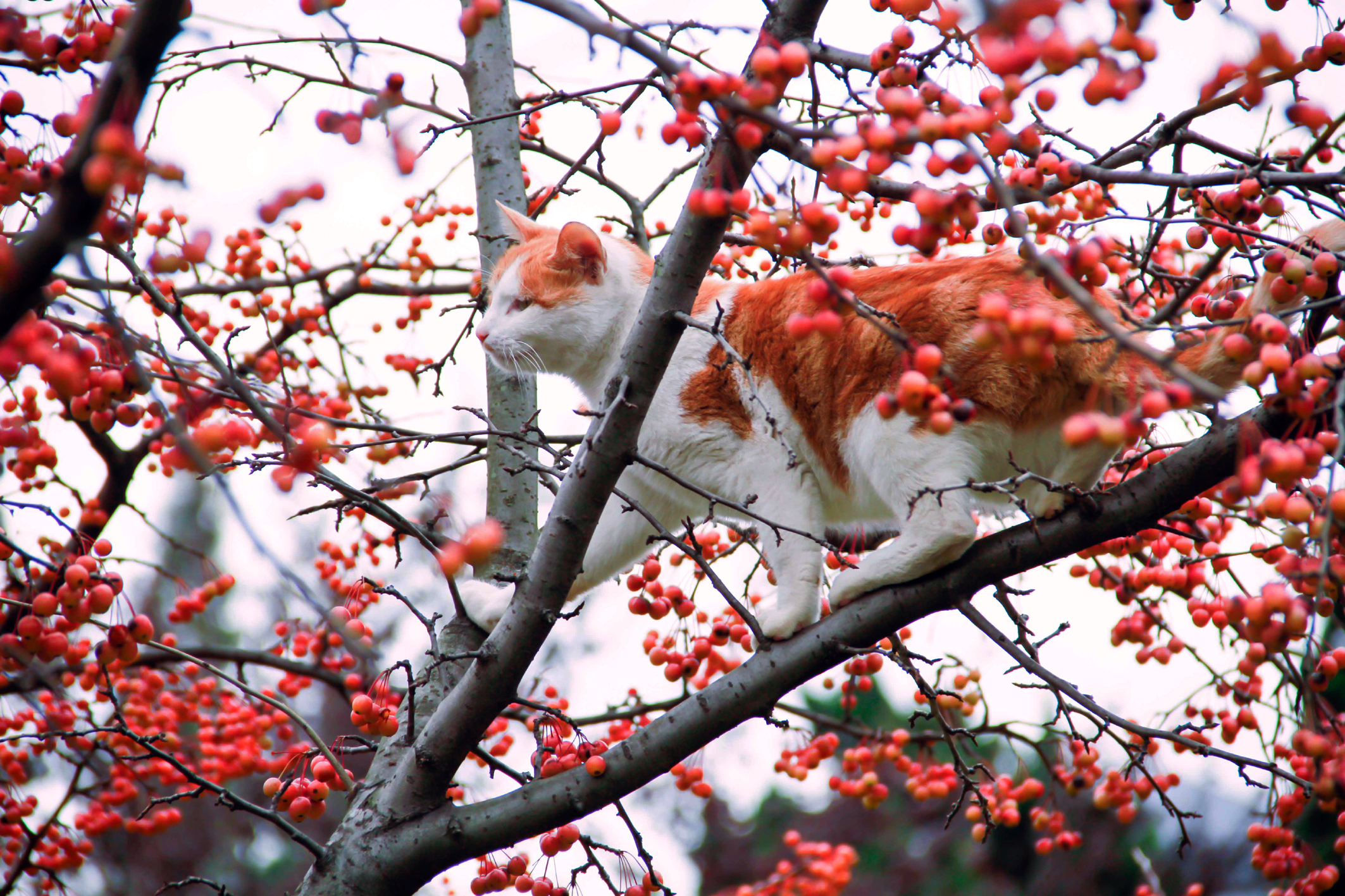 深秋的红果比起夏天的红花更加炫彩夺目,它们红得热情奔放,艳得大胆直白,为萧瑟的秋景增添了一抹令人欣喜的光亮。连猫儿都被这份热烈吸引,小心翼翼地穿梭在鲜红挂满的枝头。不知抬头细赏的人们有没有被映红了脸蛋儿?